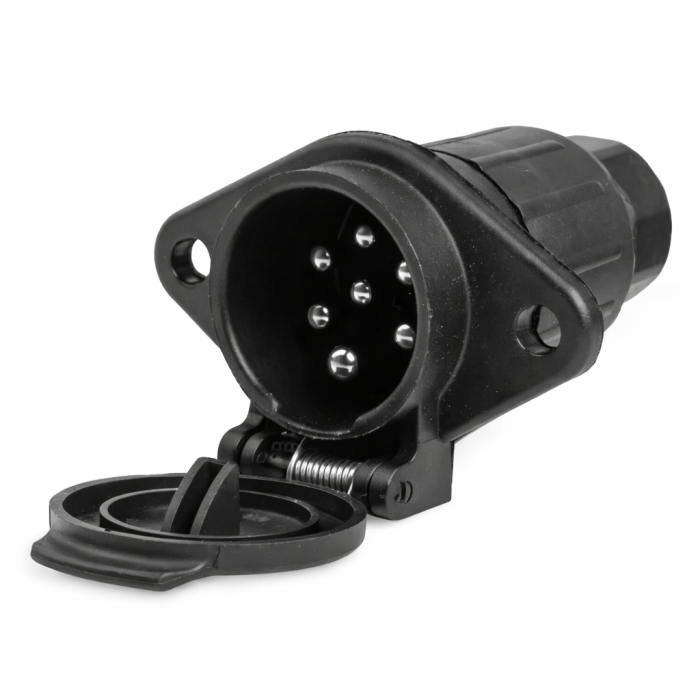 Priză universală de tip N cu 7 pini, concepută pentru a conecta și alimenta sistemul electric de 24 V în semiremorci, remorci grele și alte vehicule grele.